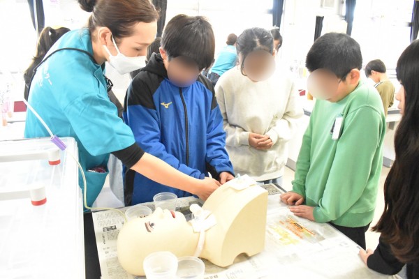 看護師ブース。胃ろう栄養の注入体験を、人形を使って一人一人行いました。